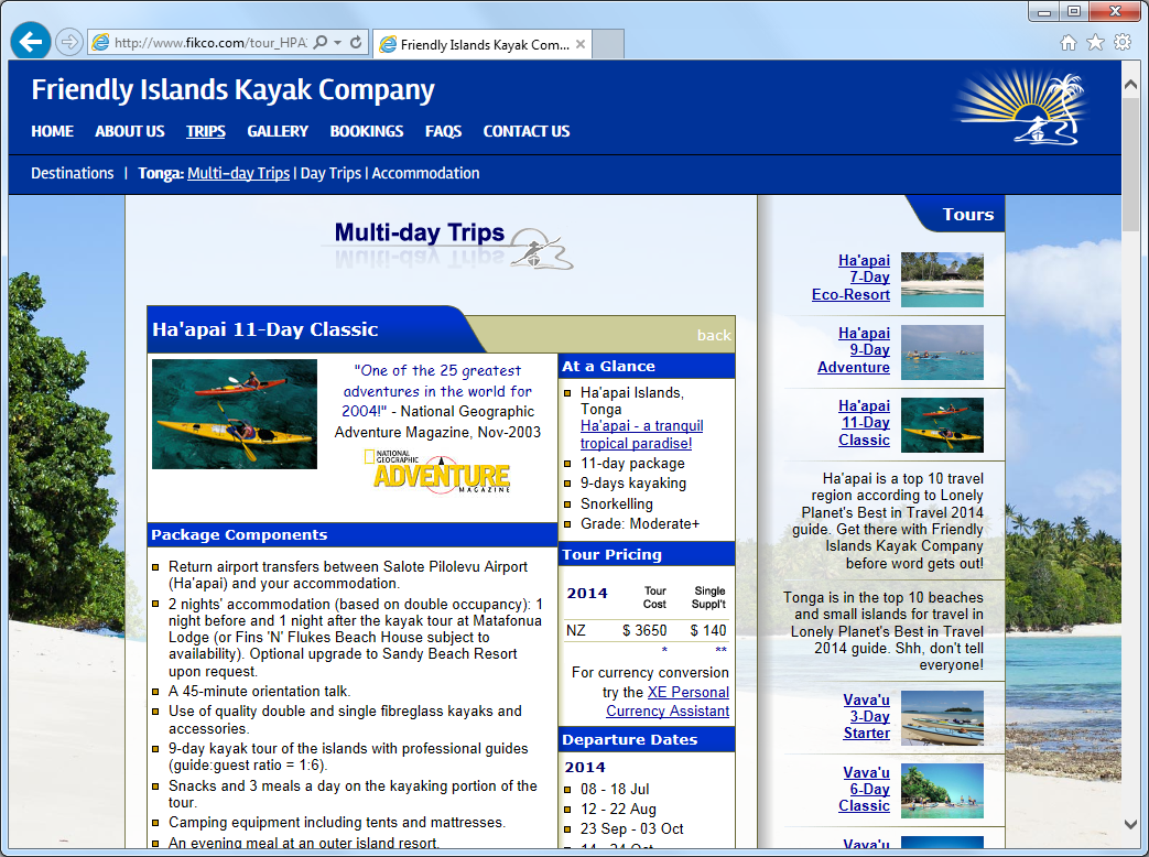 Some screenshots from the recently refreshed Friendly Islands Kayak Company website. The client was keen to refresh the colour scheme, focus in on images on their home page and replace the plain backdrop with one of the home page images.