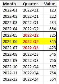 But if you’re after previous month there is no single dimension or higher level grouping that will tell you that; each month has a different previous month (unlike the case above where three months share the same common quarter). The previous month for 2022-06 is 2022-05, but 2022-06 is itself the previous month of 2022-07. Any one month is in two groups when it comes to determining previous months.