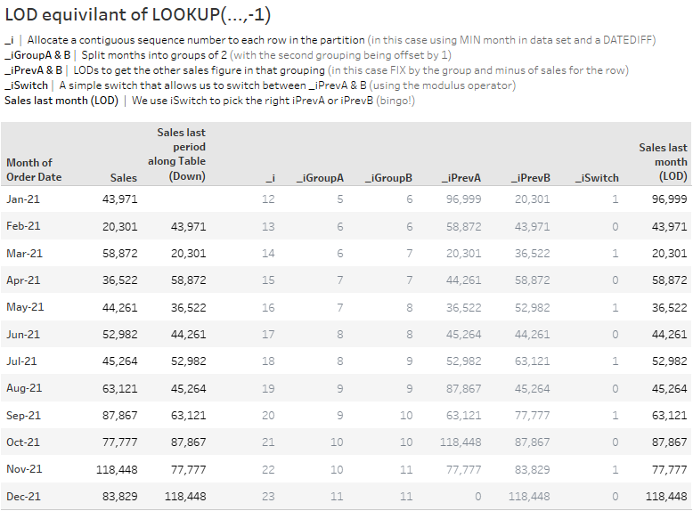 These calculations get the sum of sales for each grouping of two months, and then subtract the sales for the month we’re in. Hence we end up with the sales for the other month in the grouping. Now we just need to work out which of these LODs to use for each month. To do that we switch between them…