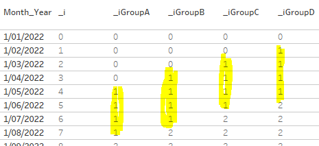 The answer was “yes” and you can check the whole thread on the Forums, including other options. The main difference from my previous post is that we needed to extend the group numbers from two to four, so that any given month falls into 4 “higher level groups” that we can target with a LOD. We then chose which LOD to use based on the index (_i).