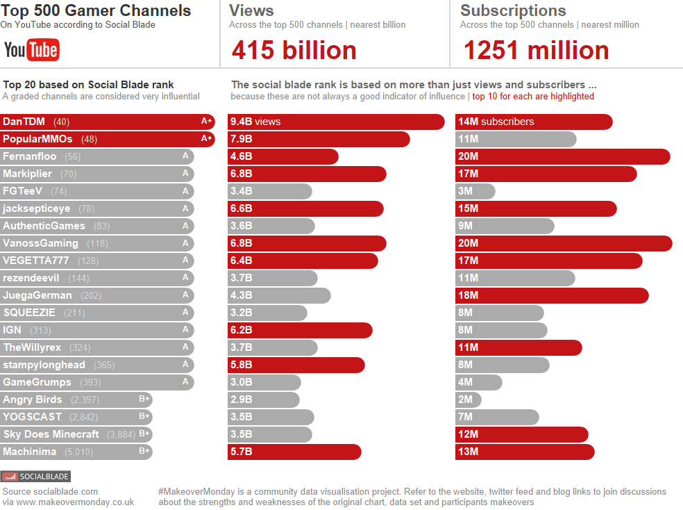 This week a look at the top 500 gamer channels on YouTube based on this list on socialblade.com. What intrigued me about this week was the immediately interesting disparity between the video views, channel subscribers and the Social Blade ranking (score) and rating (grade). The more influential channels according to Social Blade are not necessarily those with more views or more subscribers. The list itself is pretty handy but not visual engaging and there’s no real story telling or summary.