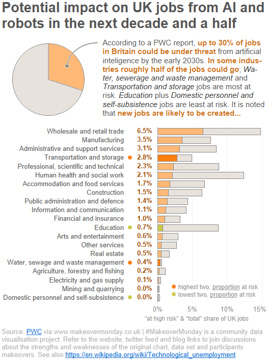 The Guardian recently reported on the a PWC report into the risk of UK job losses from breakthroughs in robotics and artificial intelligence. Whilst technological unemployment isn’t a new concept and the report and article certainly do comment on job creation too, the percentages at risk in some sectors are quite striking.