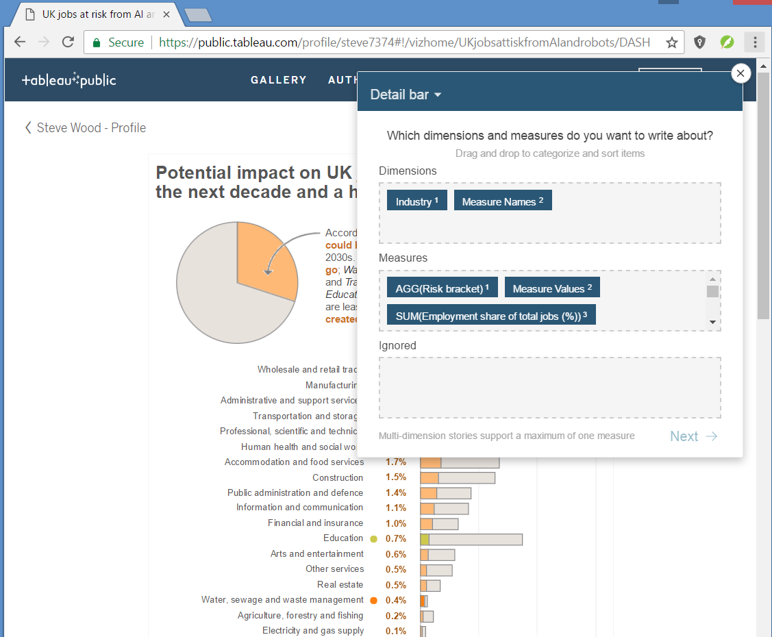 This bit took some fiddling! I couldn’t get the narrative to work without including “measure names” in the dimensions list despite not wanting to write about measure names. Perhaps this hiccup is a reflection of undue complexity in my visualisation though. For simplicity I removed all measures except the percentage share of UK jobs at risk measure.