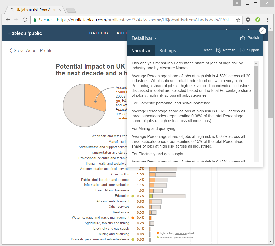 Moving on to the Tableau makeover, I really liked a submission by Tamara Gross and have borrowed some of the styling from that. My makeover follows below. I’ve converted the percentage of jobs at risk into a percentage of total UK jobs so that it is more comparable with the overall share of employment – we don’t lose the actual proportion at risk as that is apparent from the stacked bars. However we gain a set of percentages that sum up to the overall headline of 30%. The viz is also available on Tableau Public.