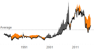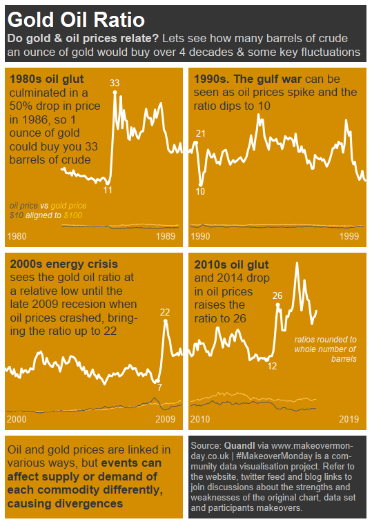 I really like the way I can make each tile focus in on a key fluctuation. The tile look was pretty straightforward to achieve. I created four separate charts – one for each decade – and set the background colour for each chart panel and axis. I appreciate that I’m not addressing every change in the ratio of gold to oil price, and perhaps haven’t even picked the most important ones, but it does allow a simple story to emerge for the reader. My story points focus on oil prices and were sourced from Wikipedia (1980s oil glut; 2000s energy crisis; 2010s oil glut). It would have been nice to add a parameter allowing the reader to chose what sort of story they wanted to read – one skewed to oil, gold or a mix. Unfortunately time didn’t allow.