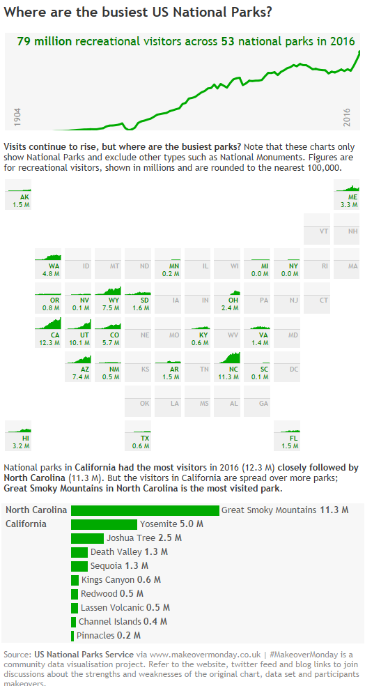 I felt that the viz petered out a little. If time allowed I’d like to have experimented with making each state tile act as a filter so that the reader could view the detailed park data for whichever state they wanted. Other than that some graphical content to tie in with the subject of national parks would be good. Overall though I think my makeover achieved my goals and it was a good chance to try out a US tile map … and work through some data blending challenges!