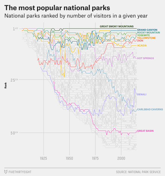 I like the original chart – actually the whole article is really interesting and the charts engaged me throughout. The chart focussed on above shows the ranking nicely, but not the actual number of visitors over time. So we don’t know how much more popular Great Smoky Mountain has been than Rocky Mountain or Yosemite. It’s hard to follow some of the threads without interactivity – although the colour coding of some of them certainly helps. You also can’t tell which states the parks in question are located in.