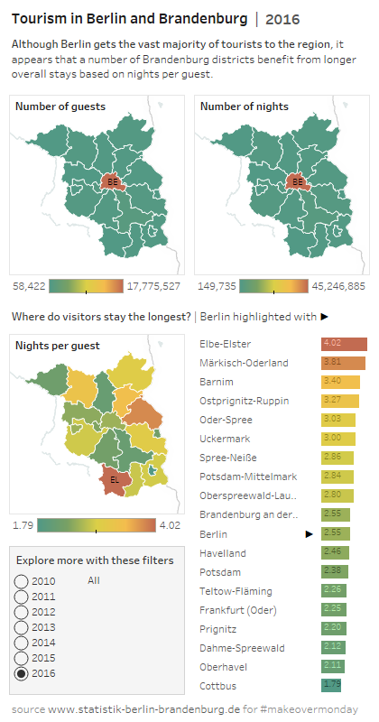 For week 27 a makeover of a filled map showing visitor stats for Berlin and Brandenburg. I’ve retained the filled maps but focussed on an angle that interested me; whilst Berlin ranks top for both number of visitors and total number of nights in all years, when you look at average nights per visitor it is one of the regional districts that usually tops the list. Check out the interactive version here on Tableau Public where you can look at different years, and explore how the figures differ for domestic or international tourists.