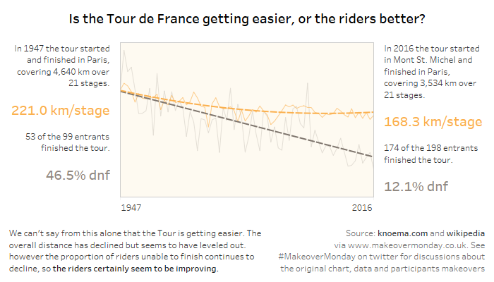 I was cycling in France around the time of the tour. Not quite at the same pace, even if we did pass a few signs! I can highly recommend a barge and bike holiday in Burgandy if you want to immerse yourself in the French countryside. Anyway here is a quick catch-up based on the week 28 data set; is the Tour de France getting easier, or the riders better? Available on Tableau Public here.