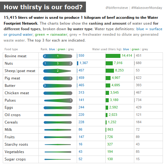 Statista put together a nice summary of how much water is used when producing various foods, using data from the Unesco Institute for Water Education. The statista version is a pretty clear bar chart which has been jazzed up into an infographic style. I recall that there were lots of great submissions from this week but didn’t remind myself of these before attempting my own makeover. Goal one was to show the breakdown by water type and goal two was to visualise the rankings – e.g. which food type uses most green water, which uses most grey. A bump chart eluded me with the blended data set I used, but I quite like the alternative I came up with anyway! Next to the ranking there is a simple bar chart for each water type so we can see the absolute amount of water used (otherwise the ranking could be a little misleading). Both charts are ordered by total water consumption and text boxes added for title, overview and column headings.
