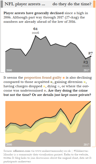 A quick post for Makeover Monday this week. We had data on NFL player arrests from 2000 to August 2017 with the aim to makeover the interactive visualisation here. Whilst exploring the data I was interested to see the free text outcome data. After grouping this I was surprised to see that the proportion of guilty outcomes seemed to be reducing over time whilst the proportion with an undetermined outcome was increasing . In hindsight you’d expect more recent cases to not yet be determined – perhaps they haven’t yet worked through the system? Still I suspect that there is a story here. Of course that story may not be specific to NFL player arrests and I haven’t checked for similar stats across the wider population.