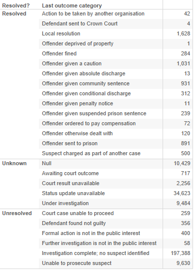 The source data came with a range of outcome descriptions which I’ve mapped to three resolution categories: unknown; resolved and not resolved. If you’re interested in digging into this mapping I’ve included it below. The reason for the unknown category is that there seems to be a lead time on getting a resolution (positive or negative) as a case works its way through the system. Having a yet to be determined / unknown category means that we can factor those out of a resolution rate. Otherwise we’d expect to see a tail off in the most recent months as the thefts are yet to be investigated, etc. Arguably a couple of the outcomes that I’ve categorised as resolved are a little unclear and a proportion of those could actually be unresolved or still in progress.