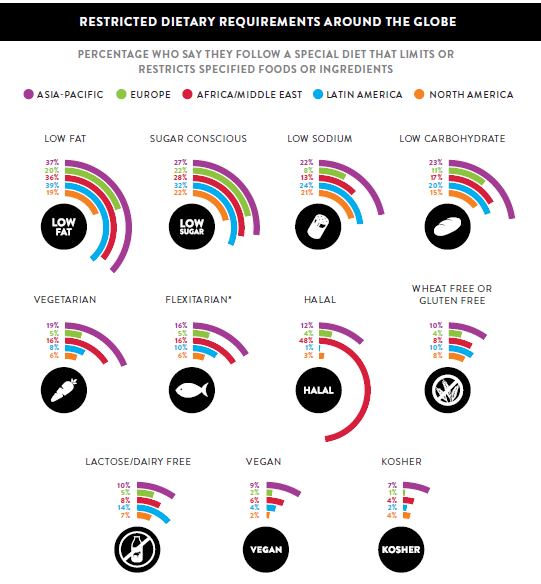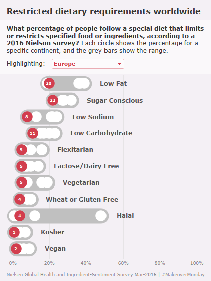 In August 2016 Nielson released a report what’s in our food and on our mind. Page 8 of the report included a set of spiral bar charts showing restricted dietary requirements around the world: