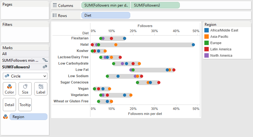 Initially I wanted to present the data in a Gantt chart format to show the range of responses for each dietary category across the continents, with each individual continent plotted as a mark within the Gantt bars. There were two problems with this as you can see in the screenshot below. Notice how the coloured circles at the extremes of each bar are centred on the ends of the bar and hence spill out of it. Also for some bars you can only see four circles due to two continents having the same percentage: