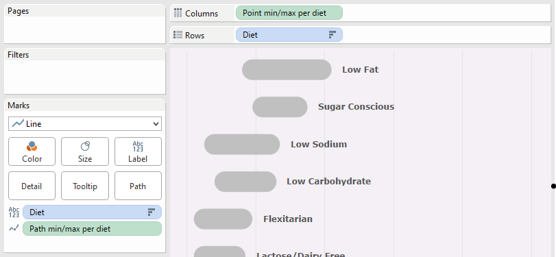 I could have switched the circles for thin bars that were the same depth as the Gantt bars. Instead I decided to try something else. I was sure I remembered a submission in week 24 with rounded ends to a Gantt chart, so figured I’d have a go at that. I ended up achieving it using lines. Is that the best way? Check out my steps below.
