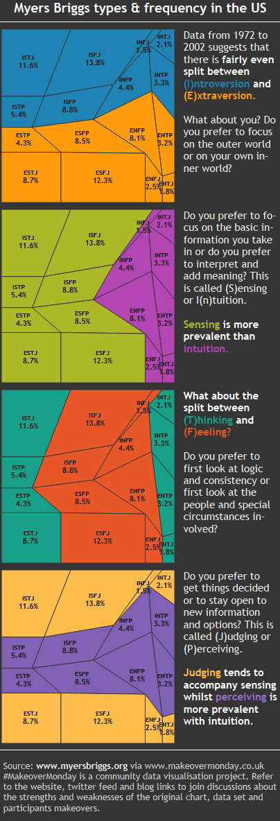 The aim was to makeover this Myers Briggs chart. I like the 4×4 grid representation of the original as we are basically looking at a mix of four attributes. I don’t really get a sense of the percentages / proportions though as every segment of the grid is the same size. I also had to flick back and forth between another page on the site to get a more detailed explanation of what the letters mean.