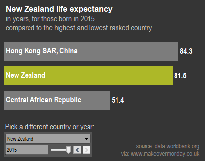 Not so much a makeover for me this week. The original chart was a WHO map of life expectancy data. I’ve just looked at a simple comparison of a country of the viewers choice with the two countries with the highest and lowest life expectancy at birth for a given year: