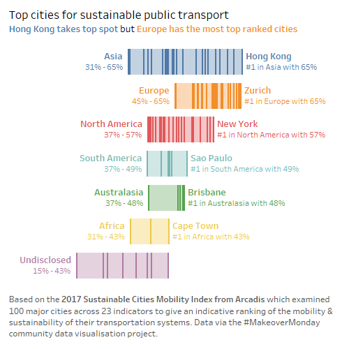 Notes: nothing particularly special here! The breakdown per continent allow two of the key stories to emerge. Hong Kong is top but there is a high concentration of European cities at the top of the ranking.