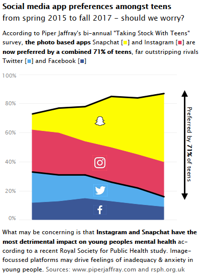 Notes: I’m pleased with the simplicity of this chart. We can clearly see that Snapchat has grown to be the main favourite. The arrow is an aligned dual axis line and shape chart to give the effect of an arrow. This allows me to highlight the combined percentage for Snapchat and Instagram before pulling in some extra information in the final paragraph about the way young people perceive those two apps.