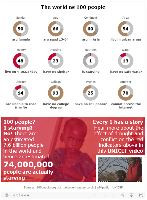 Last weeks data asked what if the world was made up of just 100 people. The original is visually interesting but hard to read as all categories are combined into one overall circle. A problem with percentages is a lack of perspective of just how many people are affected by something like starvation or malnutrition. There were some great examples from the community showing the actual number of people involved in the real world. I wanted to take this a step further and provide access to a story about just one person. The power of a story over a statistic is really interesting me at the moment as a result of a human centred design project I’m involved in.
