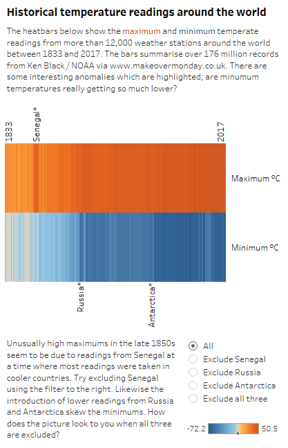 Cruising towards the end of a year of weekly makeovers with a look at over 176 million daily maximum and minimum temperature readings from around the world, over three centuries. As noted by many others, this weeks original visualisation is a tough act to follow – why try to make it better? Well I didn’t! I spent all of my time digging around what was a fascinating data set. In the end my “makeover” is simply a look at how anomalies can just be down to the fact that locations for temperature readings / estimates are introduced over time. The seeming false start for Senegal being a good case perhaps! Equally when temperatures from Antarctica were introduced is it surprising that we see the minimum temperature for the year drop dramatically? What about the impact of elevation of weather stations – over time readings are being taken from more extreme locations and I didn’t even get into looking at that!