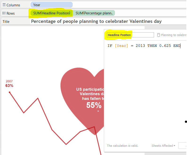 Getting nice clean spark lines was just a matter of turning off all formatting and adding calculations to provide label text for the first and last points only – a few people have covered that technique this week so check out some of the other blog posts. The heart shapes with the key stats are achieved by using a dual axis chart where the additional series has a single point, in a position specified by a calculation (in the example below at year 2013 and 62.5%, note that with no ELSE only the one point is plotted as the rest are NULL). The point is then given a custom shape, the size beefed up and label text added.