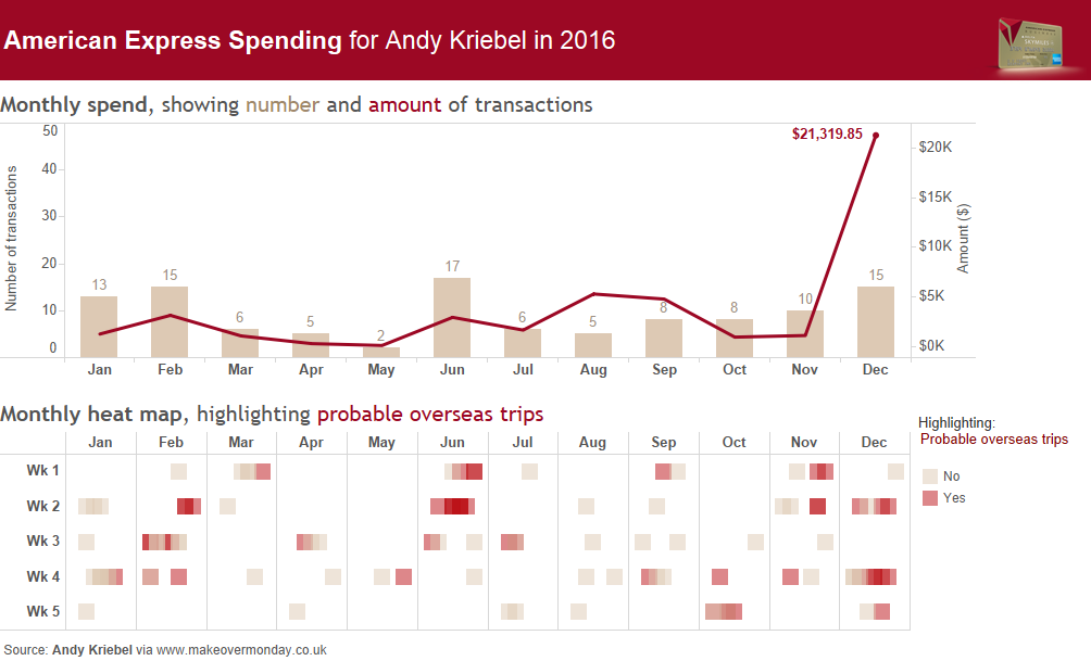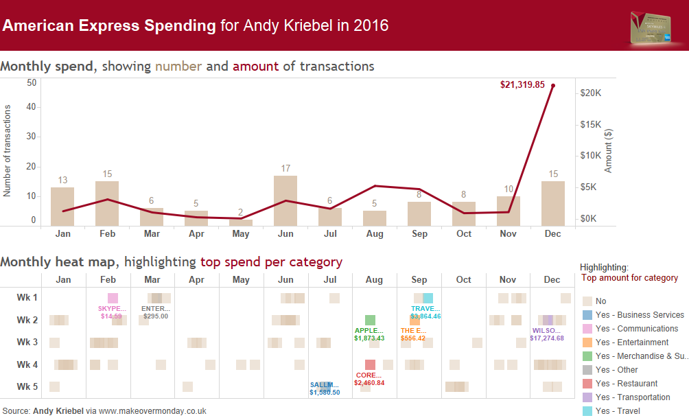 Makeover Monday week 8 and Andy Kriebel challenged the Tableau community to improve on two graphs of his American Express card expenditure. The graphs are very clean and appear to offer some drill down functionality to view transactions. There doesn’t seem to be an intermediary level of detail, e.g. sub-categories (although that may exist and we’re just not seeing it here). Also the use of a 2016 average may not be as useful as a median given that there were a couple of one off large expenses.