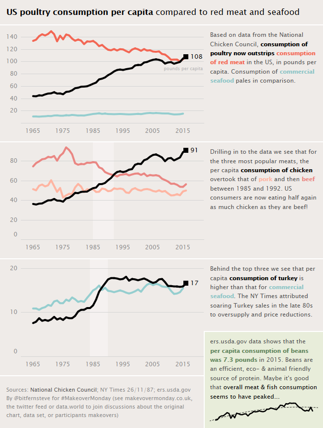 A whole new year of chart makeovers to look forward to! And this year the data is available via data.world too, with integration to a wider set of tools. We’re starting out with a look at per capita poultry consumption in the US since the 1960s based on data from the National Chicken Council; a nice clean line chart that tells the main story. The source data allows us to dive into a little more detail to expand upon the story. It was interesting to look at Turkey and seafood, and also to try to find equivalent data for plant-based proteins.