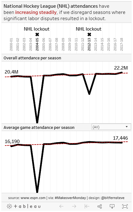 Makeover Monday 2019 week 1 looks at NHL attendances since the 2000-01 season.
