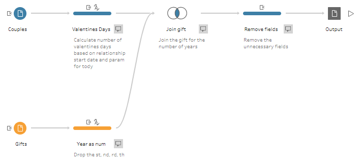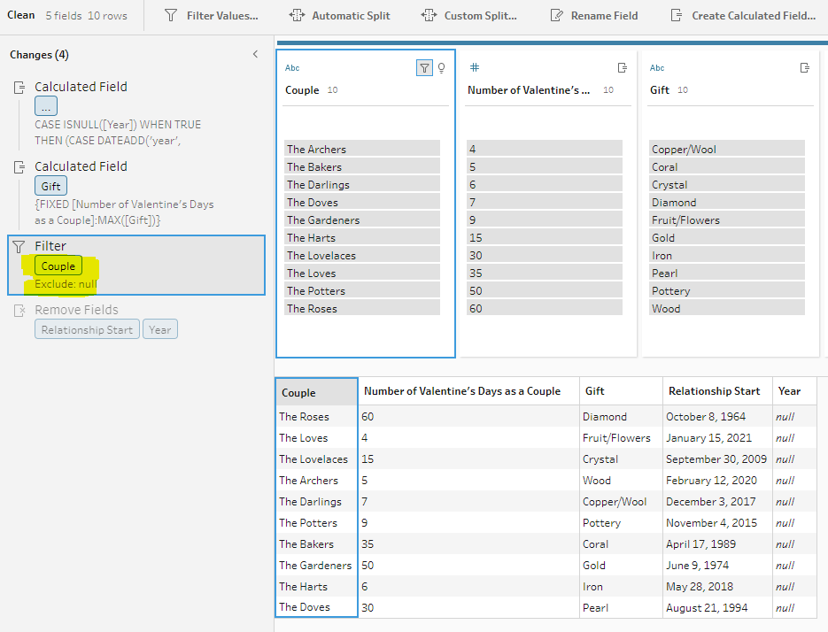 Because we have all the data in one data set we don’t need to join, instead we need to “look up” the gift from chunk B and plug it into chunk A (where it is missing). And we want to do that based on the consistent field calculated above. So in the screenshot above we can see that we have “number of valentines days as a couple” = 4 on the top row (for “The Loves”) but no gift (it is null). But we also have a row in chunk B with “number of days…” = 4 where we do have the gift (“Fruit/Flowers”).