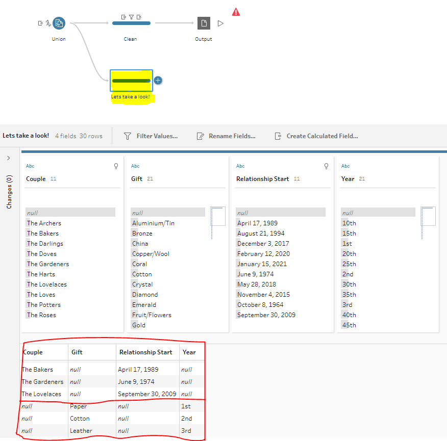 What we’re seeing here, boxed in red, is that the two tables are indeed unioned together, and so we get two chunks of data. The first chunk has the columns and rows from the first table of data (the couples and when their relationship started), and the second chunk has the columns and rows from the second table (the gift relevant to each year of a relationship – this challenge was about finding the right gift for each couple based on the length of their relationship).