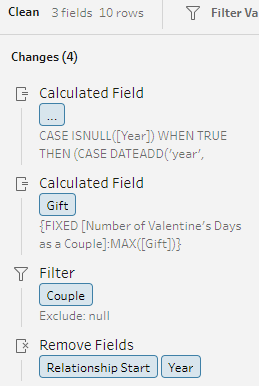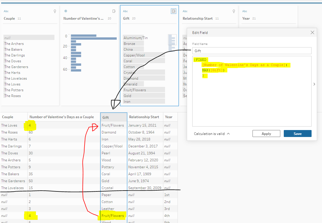 The next change handles the look up. It uses a FIXED level of detail expression to say “get me the maximum gift from across the whole data set, for this number of valentines days”. Aggregations like MAX will ignore NULLs so we in essence look up the gift from chunk B: