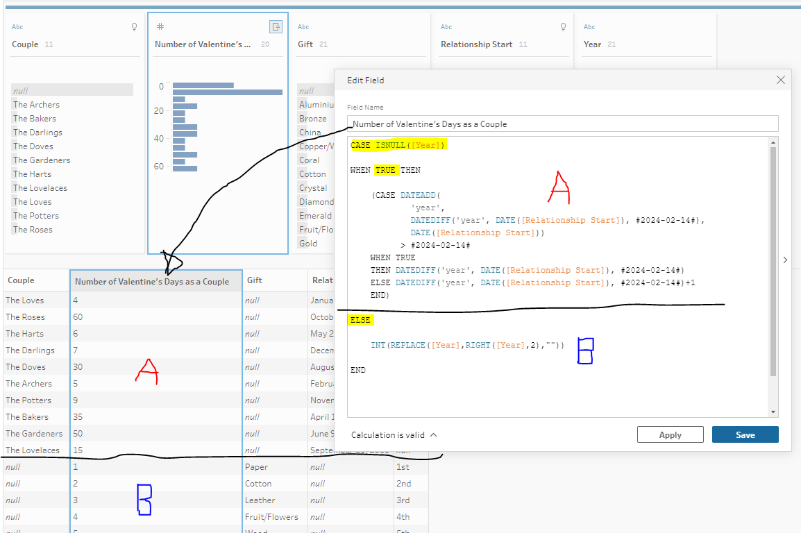 The first change is to calculate a consistent field across the two sets of data – in this case a “number of valentines days as a couple”. Where Year is NULL (no data) we’ll use the relationship start date [A] Where Year is not NULL we’ll remove the st, nd, rd, th letters from that Year field to just leave a number [B]. In a multi-step solution this would be the consistent field to join the two data sets together.