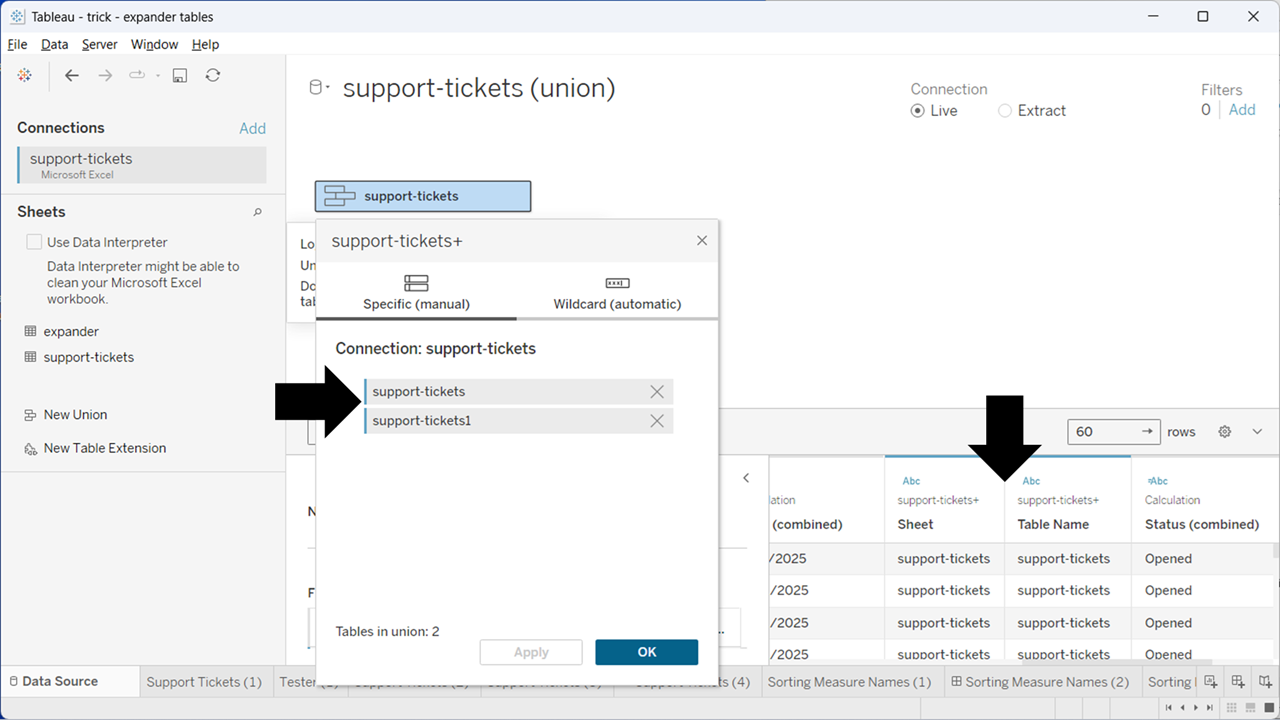 The union (first black arrow) gives you two copies of the data, differentiated by two new fields – Sheet and Table Name (second black arrow).