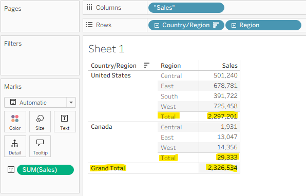 Here I have a view showing sales by country and region. I’ve turned on grand totals and sub totals for rows so that I get the overall total and a sub-total per country: