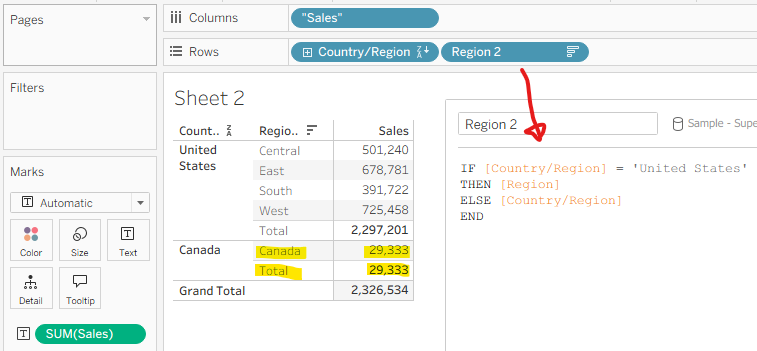 If I only wanted the breakdown to region for the US, with Canada shown as a single combined row, then I could create a calc to only return region for US. But if I still want a sub-total for the US I would also get a sub-total for Canada which is unwanted: