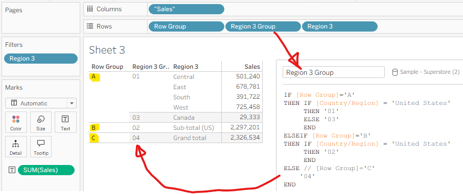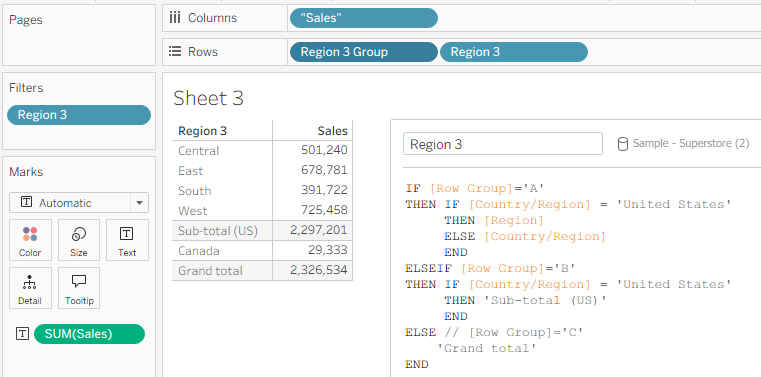 Pointed out in red there is also a “Region 3 Group” calc which is ensuring that the sub-total row for the US is “less” than the detail row for Canada (“02” vs “03”).
