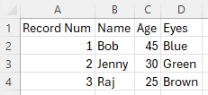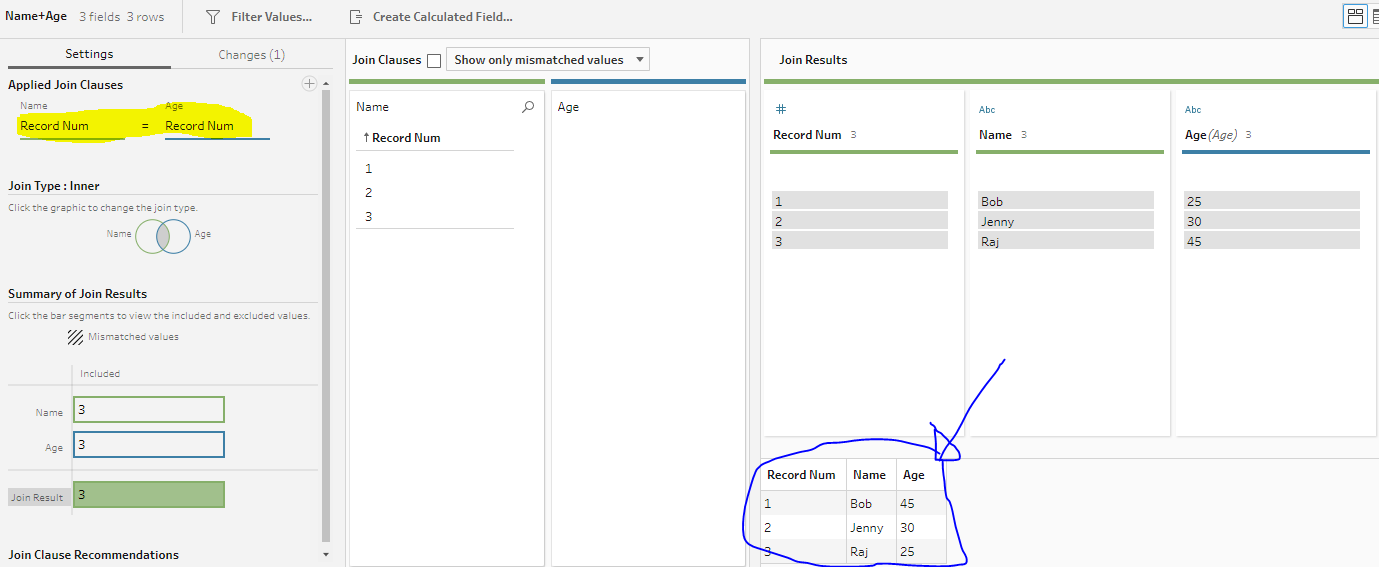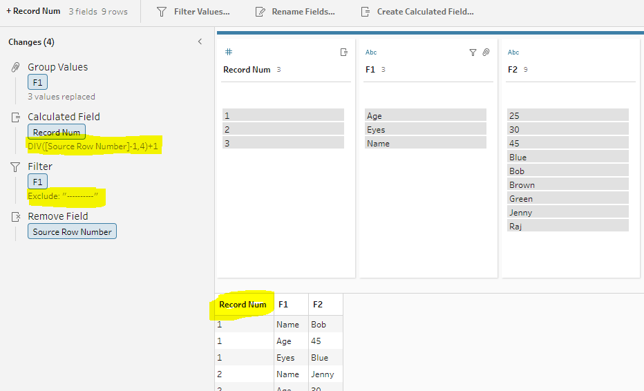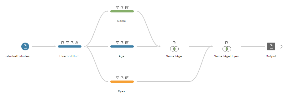 - Join steps (Name+Age and Name+Age+Eyes) to join the data set for each field back together to give a traditional record structure