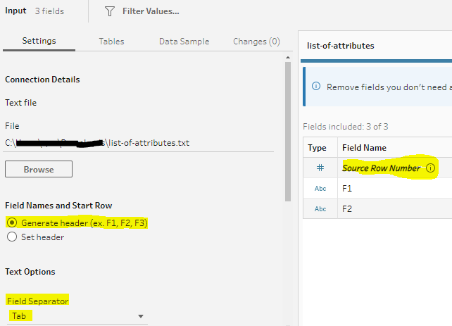 The input step defines a split on TAB, headers (F1, F2, etc.), and enables the built in source row number that Prep can add. This row number will be important for identifying a record number next.