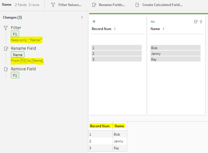 Next we have a clean up step per field to grab just that field and it’s row number, including renaming the column header (F2) to the field name. Here is the step for “Name”: