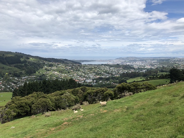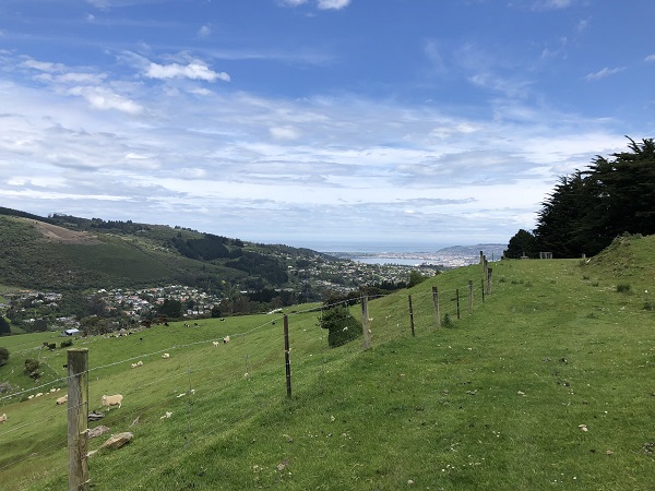 My favourite part of this walk was where Campbells Road becomes a paper road. After going through a gate (and a quick check that I was sticking to the right line / middle track) the route became a lush grassy farm track fenced off from the sloping lower paddocks and sheep. The views back down the valley to the harbour and city were spectacular, and the sun was starting to break through the cloud! Please be respectful of the adjacent land owners farm land – leave gates as you find then, avoid startling stock (stay away during lambing), etc.